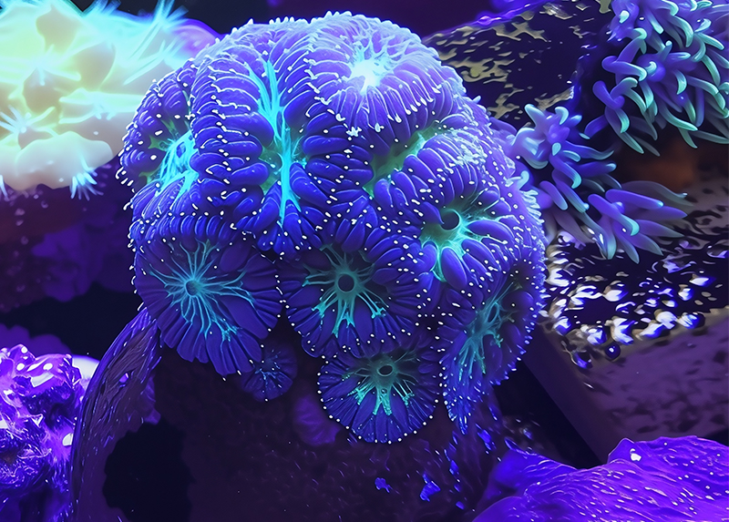 این مرجان با نور کم و جریان ملایم، رنگ های زنده تری نشان می دهد و تحت نور شدید ممکن است bubble یا inflate شود، که آن را برای تانک های modest lighting مناسب می کند. مزایا شامل hardy بودن، سازگاری با beginners، و پاسخ مثبت به feeding (مانند mysis shrimp) برای رشد بهتر است. غیر تهاجمی بودن آن اجازه همزیستی با corals صلح آمیز را می دهد و fragging نسبتاً آسان (با band saw) برای propagation امکان پذیر است. همچنین، در آکواریوم های established، با پارامتر های پایدار، رشد مداوم بدون نیاز به فضای زیاد دارد و زیبایی fluorescent تحت نور آبی را ارائه می دهد.